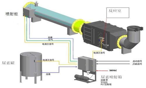 煙氣脫硝系統(tǒng)的工作原理是尿素溶液在排氣管道混合區(qū)遇高溫?zé)煔夥纸獬砂睔猓∟H3) 和水(H2O), 與煙氣充分混合后進(jìn)入催化劑模塊, 在催化反應(yīng)區(qū)NH3 和NOX反應(yīng)生成無(wú)害的氮?dú)?N2)和水(H2O), 然后通過(guò)排氣管道排到大氣中。尿素溶液分解如下:CO(NH2)2 + H2O = 2NH3 + CO2,尿素經(jīng)熱解、水解生成氨氣,為反應(yīng)提供原料。